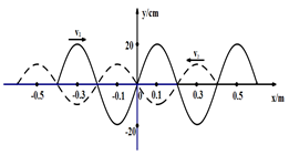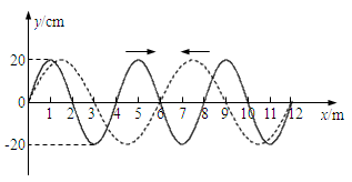 两列简谐横波的振幅都是20cm,传播速度大小相同。实线波的频率为2Hz,沿x轴正方向传播;虚线波沿x轴负方向传播。某时刻两列波在如图所示区域相遇,则_________。![]()