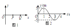如下图1所示,一根水平张紧弹性长绳上有等间距的O、P、Q质点,相邻两质点间距离为1.0m。t=0时刻O质点从平衡位置开始沿y轴方向振动,并产生沿x轴正方向传播的波,O质点的振动图象如图2所示.当O质点第一次达到正向最大位移时,P质点刚开始振动,则( )![]()