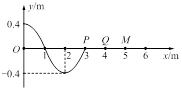 P、Q、M是某弹性绳上的三个质点,沿绳建立x坐标轴。一简谐横波正在沿x轴的正方向传播,振源的周期为0.4s。在t=0时刻的波形如图所示,则在t=0.2s时![]()
