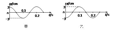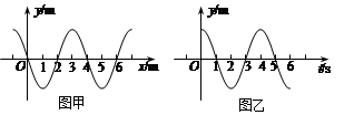 甲、乙两图分别表示一简谐横波在传播方向上相距3.0m的两质点的振动图像,而且甲质点比乙质点先起振。如果波长大于1.5m,小于3.0 m则该波的波速大小是( )![]()