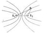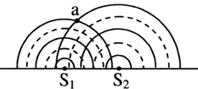 两波源S1、S2在水槽中形成的波形如图所示,其中实线表示波峰,虚线表示波谷,则![]()