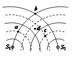 如图所示,S1、S2是两个相干波源,它们振动同步且振幅相同。实线和虚线分别表示在某一时刻它们所发出的波的波峰和波谷。关于图中所标的a、b、c、d四点(d是S1、S2连线的中垂线上的一点),下列说法中正确的有![]()