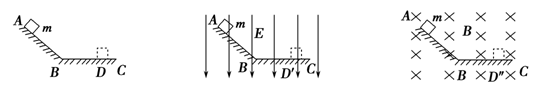 如图所示,一个带正电荷的物块m,由静止开始从斜面上A点下滑,滑到水平面BC上的D点停下来.已知物块与斜面及水平面间的动摩擦因数相同,且不计物块经过B处时的机械能损失.先在ABC所在空间加竖直向下的匀强电场,第二次让物块m从A点由静止开始下滑,结果物块在水平面上的D′点停下来.后又撤去电场,在ABC所在空间加水平向里的匀强磁场,再次让物块m从A点由静止开始下滑,结果物块沿斜面滑下并在水平面上的D″点停下来.则以下说法中正确的是( )![]()