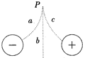 静电在各种产业和日常生活中有着重要的应用,如静电除尘、静电复印等,所依据的基本原理几乎都是让带电的物质微粒在电场作用下奔向并吸附到电极上。现有三个粒子a、b、c从P点向下射入由正、负电极产生的电场中,它们的运动轨迹如图所示,则( )![]()