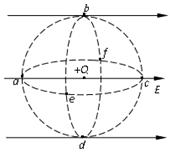 如图所示匀强电场E的区域内,在O点处放置一点电荷+Q,a、b、c、d、e、f为以O点为球心的球面上的点,aecf平面与电场平行,bedf平面与电场垂直,则下列说法中正确的是 ![]()