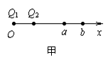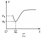 如图甲所示,两个点电荷Q1、Q2固定在x轴上距离为L的两点,其中Q1带正电位于原点O,a、b是它们连线延长线上的两点,其中b点与O点相距3L。现有一带正电的粒子q以一定的初速度沿x轴从a点开始经b点向远处运动(粒子只受电场力作用),设粒子经过a,b两点时的速度分别为va,vb,其速度随坐标x变化的图象如图乙所示,则以下判断正确的是![]()