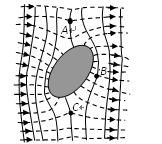 某导体置于电场后周围的电场分布情况如图所示,图中虚线表示电场线,实线表示等势面,A、B、C为电场中的三个点。下列说法错误的是![]()