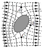 某导体置于电场后周围的电场分布情况如图所示,图中虚线表示电场线,实线表示等势面,A、B、C为电场中的三个点。下列说法错误的是:![]()