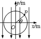如图所示,在xOy平面内有一个以O为圆心、半径R=0.1m的圆,P为圆周上的一点,O、P两点连线与x轴正方向的夹角为θ。若空间存在沿y轴负方向的匀强电场,场强大小E=100V/m,则O、P两点的电势差可表示为![]()