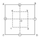 现有两个边长不等的正方形,如图所示,且Aa、Bb、Cc、Dd间距相等。在AB、AC、CD、DB的中点分别放等量的正电荷和负电荷,若取无穷远处电势为零,则下列说法中正确的是![]()