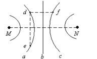 如图所示,真空中M、N 处放置两等量异号点电荷,a、b、c表示电场中的3条等势线,d点和e点位于等势线a 上,f 点位于等势线c上,d f平行于M N。已知一带正电的试探电荷从d点移动到f点,试探电荷的电势能增加,则以下判断正确的是![]()