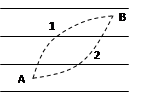 如图所示,平行线代表电场线,但未标明方向,一个带正电、电量为10-6 C的微粒在电场中仅受电场力作用,当它从A点运动到B点时(轨迹为虚线1、2中的某一条)动能减少了10-5 J,已知A点的电势为-10 V,则以下判断正确的是( )