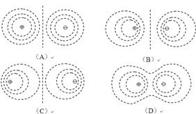 如图所示,图中两组曲线中实线代表电场线(方向未画出)、虚线代表等势线,点划线是 一个带电粒子仅在电场力作用下从A到B的运动轨迹,下列说法正确的是 ( )![]()