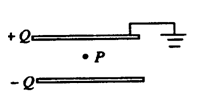如图所示,一平行板电容器充电后与电源断开,这时电容器的带电量为Q,P是电容器内一点,电容器的上板与大地相连,下列说法正确的是![]()