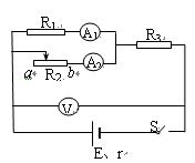 在如图所示的电路中,E为电源电动势,r为电源内阻,R1和R3均为定值电阻,R2为滑动变阻器。当R2的滑动触点在a端时合上开关S,此时三个电表A1、A2和V的示数分别为I1、I2和U。现将R2的滑动触点向b端移动,则三个电表示数的变化情况是( )![]()