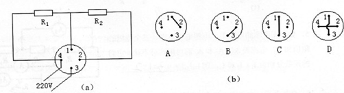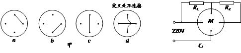 有一只电熨斗,内部电路如图乙所示,其中M为旋钮的内部接线端子,旋钮有“高”、“中”、“低”、“关”四个档,每个挡内部接线有如图甲中所示的四种方式,下列判断中正确的是![]()