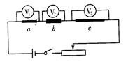 如图所示,a、b、c为同一种材料做成的电阻,b与a的长度相等,横截面积是a的两倍;c与a的横截面积相等,长度是a的两倍. 当开关闭合后,三个理想电压表的示数关系是 ( )![]()