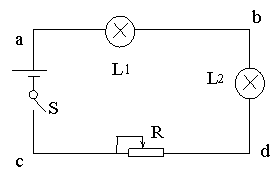 如图所示的电路中,电源电动势为6V,当开关S接通后,灯泡L1和灯泡L2都不亮,用电压表测得各部分电压是Uab=0V,Uad=0,Ucd=6V,由此可断定( )![]()