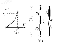 一个用半导体材料制成的电阻器D,其电流I随它两端电压U变化的关系图像如图(a)所示,将它与两个标准电阻R1、R2组成如图(b)所示电路,电路两端加恒定电压,当电键S接通位置1时,三个用电器消耗的电功率为P. 当电键S接通位置2时,电阻器D 和电阻消耗的电功率分别是PD、P1、P2,下列关系中正确的是![]()