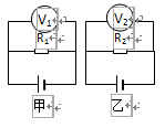 如图所示,甲、乙两电路中电源完全相同,内阻不能忽略,电阻R1>R2。图中电压表为理想表。当在两电路中通过相同的电量q的过程中,下列关于两电路的比较,正确的是:![]()