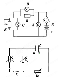 在如图所示的电路中,闭合S,A、B、C三只灯均正常发光,当可变电阻R′的滑动触头上移时,对A、B、C三灯亮度的变化,下列叙述正确的是![]()