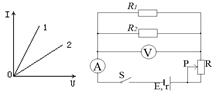 如图左所示为两电阻R1和R2的伏安特性曲线。将电阻R1和R2接入如图右所示电路中,闭合开关s后,当滑动变阻器触片P向下移动时,则( )![]()