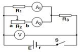 在如图所示的电路中,E为电源电动势,r为电源内阻,R1和 R3均为定值电阻,R2为滑动变阻器。当R2的滑动触点在a端时合上开关S,此时三个电表A1 、A2和V的示数分别为I1、I2和U.现将R2的滑动触点向b端移动,则三个电表示数的变化情况是( )![]()