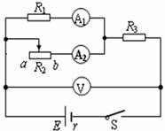 在如图所示的电路中,E为电源电动势,r为电源内阻,R1和R3均为定值电阻,R2为滑动变阻器。当R2的滑动触点在a端时合上开关S,此时三个电表A1、A2和V的示数分别为I1、I2和U。现将R2的滑动触点向b端移动,则三个电表示数的变化情况是![]()