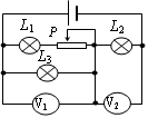 如图所示,电源电动势为E,内电阻为r.当滑动变阻器的触片P从右端滑到左端时,发现电压表V1、V2示数变化的绝对值分别为ΔU1和ΔU2,下列说法中正确的是 ( ) ![]()