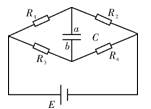 在如图所示的电路中,已知电容C=2μF,电源电动势E=12V,内电阻不计,R1∶R2∶R3∶R4=1∶2∶6∶3,则电容器极板a上所带的电量为![]()