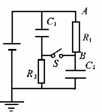 如图所示,已知R1>R2,C1=C2,当S断开时,C1内有一带电粒子处于平衡状态,下面叙述正确的是 ( )![]()