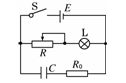 在如图所示的电路中,电源电动势为E,内电阻为r,C为电容器,R0为定值电阻,R为滑动变阻器.开关闭合后,灯泡L能正常发光。当滑动变阻器的滑片向右移动时,下列判断正确的是![]()
