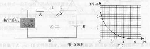 如图所示连接电路,电源电动势为6V。先使开关S与1端相连,电源向电容器充电,这个过程可在瞬间完成。然后把开关S掷向2端,电容器通过电阻R放电,电流传感器将测得的电流信息传人计算机,屏幕上显示出电流随时间变化的I – t 曲线如图2所示。据此图可估算出电容器释放的电荷量,并进而估算出电容器的电容为 ( )![]()