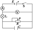 如图所示,当平行板电容器C充电后把电键S断开.设电容器电压为U,电量为Q.现只将电容器两板的正对面积减小,则![]()