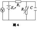 在温控电路中,通过热敏电阻阻值随温度的变化可实现对电路相关物理量的控制.如图4所示电路,R1为定值电阻,R2为半导体热敏电阻(温度越高电阻越小),C为电容器.当环境温度降低时![]()