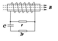 图所示,线圈匝数为n,横截面积为S,线圈电阻为r,处于一个均匀增强的磁场中,磁感应强度随时间的变化率为k,磁场方向水平向右且与线圈平面垂直,电容器的电容为C,两个电阻的阻值分别为r和2r。由此可知,下列说法正确的是![]()