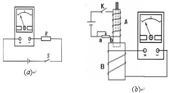 将图(a)中的开关闭合,电流计指针由中央向左偏转。在图(b)中,闭合开关后,要使电流计指针由中央向左偏转,可以采取的办法有:(1)_____________________;(2)_____________________。