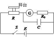 (9分)有一种测量压力的电子秤,其原理图如图所示。E是内阻不计、电动势为6V的电源。R0是一个阻值为400Ω的限流电阻。G是由理想电流表改装成的指针式测力显示器。R是一个压敏电阻,其阻值可随压力大小变化而改变,其关系如下表所示。C是一个用来保护显示器的电容器。秤台的重力忽略不计。试分析: