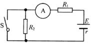 如图所示,R1=5Ω,R2=9Ω。当开关S断开时,电流表的示数为I=0.2A当开关S闭合时,电流表的示数为=0.3A。(电流表内阻不计)求:电源的电动势和内阻.
