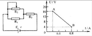 在如图所示的电路中,R1、R2均为定值电阻,且R1=100Ω,R2阻值未知,R3是一滑动变阻器,当其滑片从左端滑至右端时,测得电源的路端电压随电流的变化图线如图所示,其中A、B两点是滑片在变阻器的两个不同端点得到的求:(1)电源的电动势和内阻;(2)定值电阻R2的阻值;(3)滑动变阻器的最大阻值。