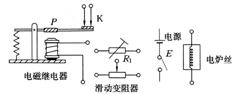 现有热敏电阻、电炉丝、电源、电磁继电器、滑动变阻器、开关和导线若干.如图所示,试设计一个温控电路.要求温度低于某一温度时,电炉丝自动通电供热,超过某一温度时,又可以自动断电.工作过程:闭合S当温度低于设计值时热敏电阻阻值大,通过电磁继电器电流不能使它工作,K接通电炉丝加热.当温度达到设计值时,热敏电阻减小到某值,通过电磁继电器的电流达到工作电流,K断开,电炉丝断电,停止供热.当温度低于设计值,又重复前述过程.试根据所给器材按要求连接电路。