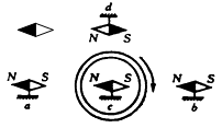 | C.d不动, c的N极朝纸外。a、b的N极朝纸内 |