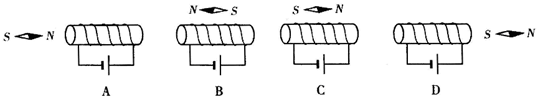 长直螺线管内有一个可自由转动的小磁针,静止时如图所示,则螺线管中![]()