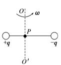 如图所示,真空中两点电荷+q和-q以共同的角速度绕轴OO′匀速运动,P点距+q近,则P点磁感应强度的方向为( )![]()