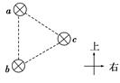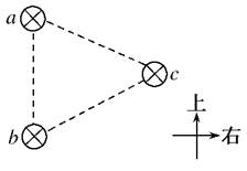 在等边三角形的三个顶点a,b,c处,各有一条长直导线垂直穿过纸面,导线中通有大小相等的恒定电流,方向如图.过c点的导线所受安培力的方向( )![]()