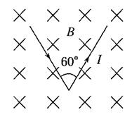 如图,长为2l的直导线折成边长相等,夹角为60°的V形,并置于与其所在平面相垂直的匀强磁场中,磁感应强度为B,当在该导线中通以电流强度为I的电流时,该V形通电导线受到的安培力大小为( )![]()