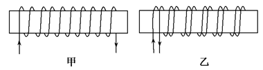 取两个完全相同的长导线,用其中一根绕成如图甲所示的螺线管,当该螺线管中通以电流强度为I的电流时,测得螺线管内中部的磁感应强度大小为B,若将另一根长导线对折后绕成如图乙所示的螺线管,并通以电流强度也为I的电流时,则在螺线管内中部的磁感应强度大小为( )![]()