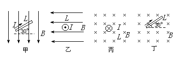 如图所示的四种情况中,匀强磁场磁感应强度相同,导体长度相同,通过的电流也相同,导体受到的磁场力最大,且方向沿着纸面的情况是( )![]()