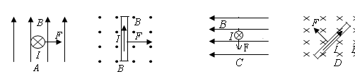 长度为L、通有电流为I的直导线放入一匀强磁场中,电流方向与磁场方向如图所示,已知磁感应强度为B,对于下列各图中,导线所受安培力的大小计算正确的是( )![]()