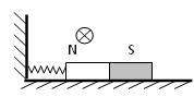 如图所示,在光滑水平面上一轻质弹簧将挡板和一条形磁铁连接起来,此时磁铁对水平面的压力为N1,现在磁铁左上方位置固定一导体棒,当导体棒中通以垂直纸面向里的电流后,磁铁对水平面的压力为N2 ,则以下说法正确的是( )![]()